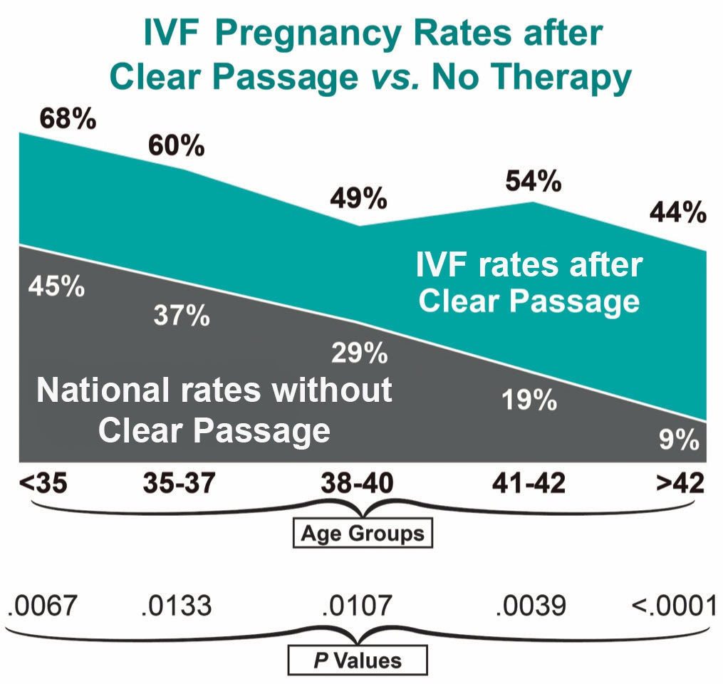 As a Clear Passage® affiliate, your therapists will be taught exclusive trade secrets for this revolutionary drug-free, non-surgical solution – one that is literally changing lives throughout the world. We serve as a complement to IVF, and often as a conduit into the IVF process. Performed before embryo transfer, Clear Passage has increased IVF pregnancy rates by 50% overall with statistically significant increases in every age group. Pregnancy rates for women over age 40 are roughly three to five times the norm cited by SART and CDC.